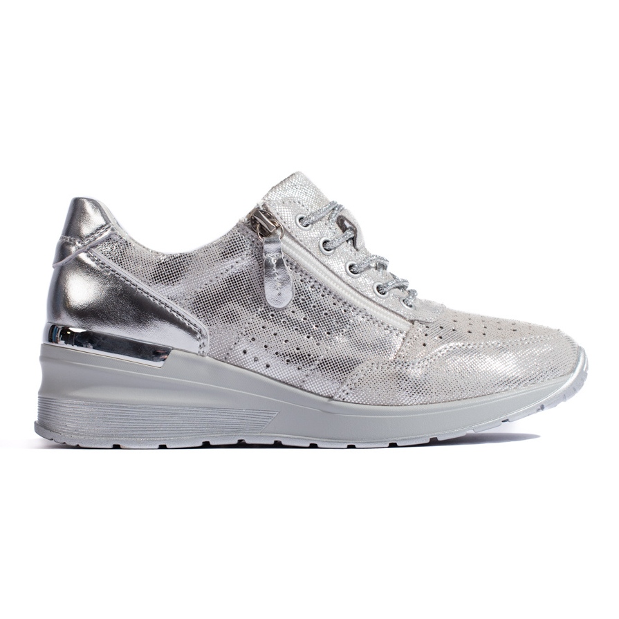 Nämä hopeiset kiilalenkkarit ovat täydellinen valinta naisille, jotka arvostavat urheilullisen tyylin ja eleganssin yhdistelmää. Täydelliset jokapäiväiseen muotoiluun, ne ovat täydellisiä sekä kaupungissa että kävelyllä. Valitse mukavuus ja tyyli tällä ainutlaatuisella mallilla, josta tulee varmasti suosikkiparisi kokoelmassasi!