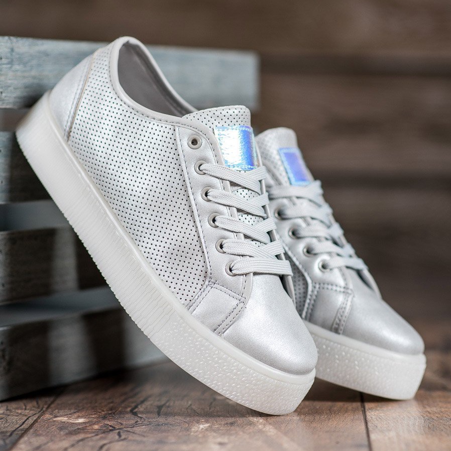 Hopeiset tennarit, joissa on harjakattoinen kuviointi, ovat täydellinen valinta pastellimekkoihin ja farkkuihin luoden epätavallisia ja tyylikkäitä tyylejä. Kulutuspinnalla varustetun synteettisen pohjan ja pehmeän kantapään ansiosta ne tarjoavat maksimaalisen mukavuuden koko päivän. Pyöreä nenä ja nauhakiinnitys antavat niille urheilullisen luonteen, ja 2 senttimetrin alusta tekee niistä paitsi mukavia, myös muodikkaita.