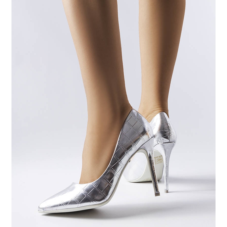 Löydä eleganssia ja naisellisuutta PA1:n Raison-pumpuilla, jotka ilahduttavat paitsi ulkonäöllään myös käyttömukavuudellaan. Nämä hopeanväriset korkokengät, joissa on krokotiilin ihokuvio, ovat täydellinen valinta naisille, jotka haluavat erottua joukosta. Ohut, 10 cm korkea kantapää ja terävä kärki saa jalat näyttämään ilmiömäisiltä ja sirottamaan vartaloa.