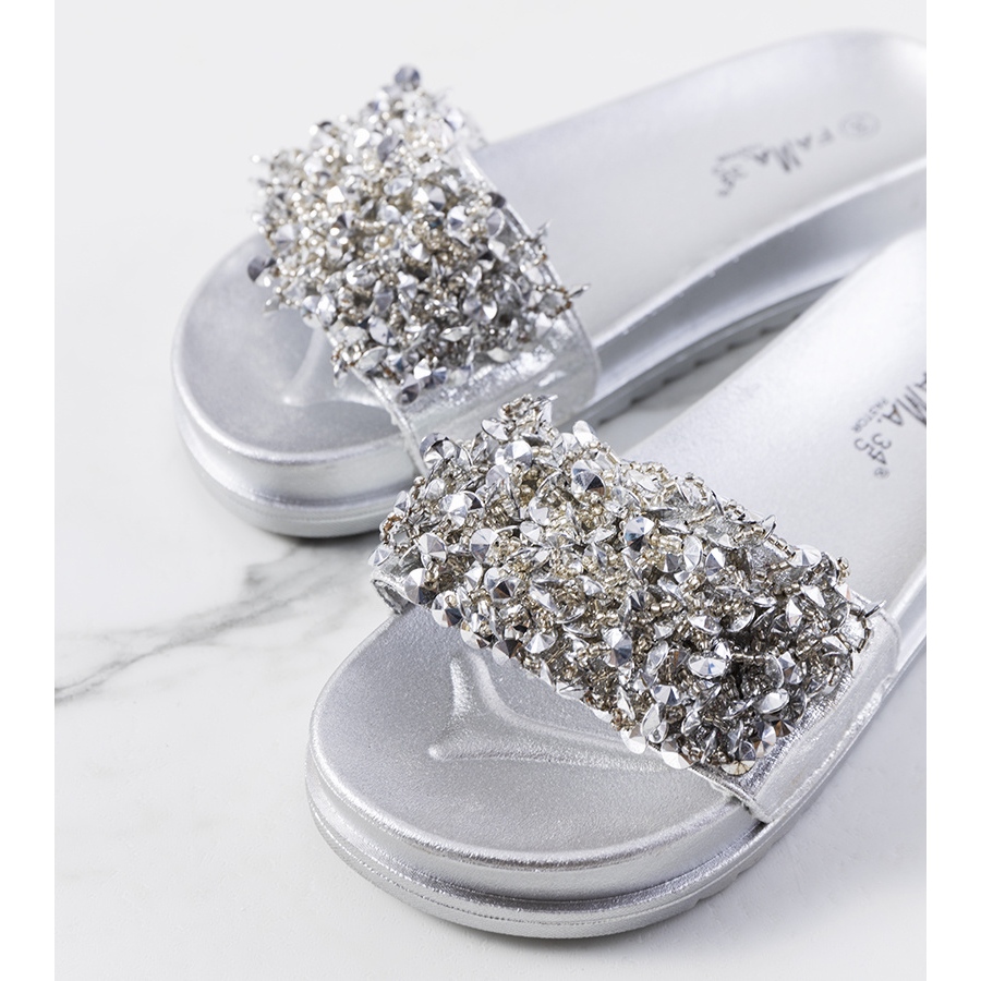 Strassilla koristeltu varvastossojen hopeanvärinen väri lisää kiiltoa mihin tahansa asuun. Yksinkertaisen muodon ja pyöreän kärjen ansiosta Marthasin varvastossut sopivat hyvin sekä kesämekkoihin että arkeen. Numerointi on vähäistä, joten suosittelemme valitsemaan suuremman koon täydellisen istuvuuden varmistamiseksi.