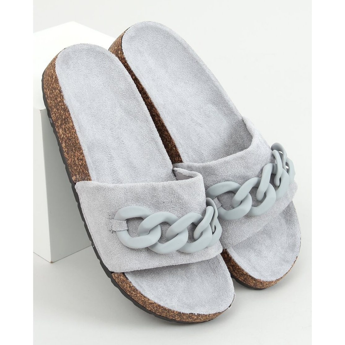 Tutustu kesäiseen eleganssiin Jarvis Grey -korkkiliukumäillä, joissa on harmaa ketju. Nämä ainutlaatuiset naisten varvastossut, jotka on valmistettu laadukkaasta ekologisesta mokkanahasta, yhdistävät tyylin ja mukavuuden ja sopivat täydellisesti jokapäiväiseen käyttöön. Leveä hihna ja profiloitu sisäosa tarjoavat poikkeuksellisen mukavuuden jokaisessa vaiheessa, joten voit matkustaa vapaasti pitkiä matkoja.