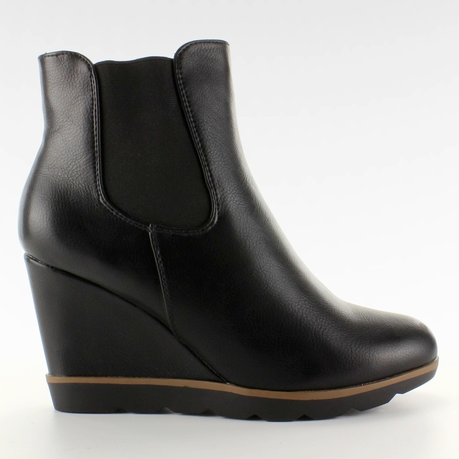 Tyylikkäät mustat naisten nilkkurit, joissa on stiletto-leikkaus, kiinteä kiila (8,5 cm). Valmistettu ekologisesta nahasta, sivuilla on käytännölliset joustavat lisäkkeet helpottamaan pukemista. Kengät on täysin vuorattu pehmeällä turkilla, mikä takaa lämmön ja mukavuuden kylmimpinä päivinä. Pohjan ympärillä on kontrastivärinen putkisto, joka lisää malliin luonnetta.