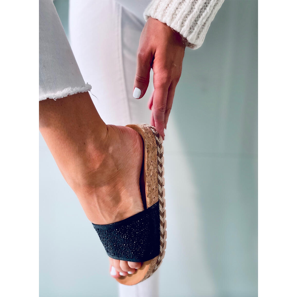 Pellavalangalla kudottu pohja ja metallinen viimeistely ovat elementtejä, jotka korostavat tämän mallin kesäistä tunnelmaa. Jova Black -varvastossut on valmistettu korkealaatuisesta nahkamaisesta kankaasta, mikä varmistaa kestävyyden ja helpon huollon. Ekologisesta nahasta valmistettu profiloitu pohjallinen takaa mukavuuden ja istuvuuden jalkaan, mikä tekee niistä erinomaisen valinnan jokapäiväiseen käyttöön.