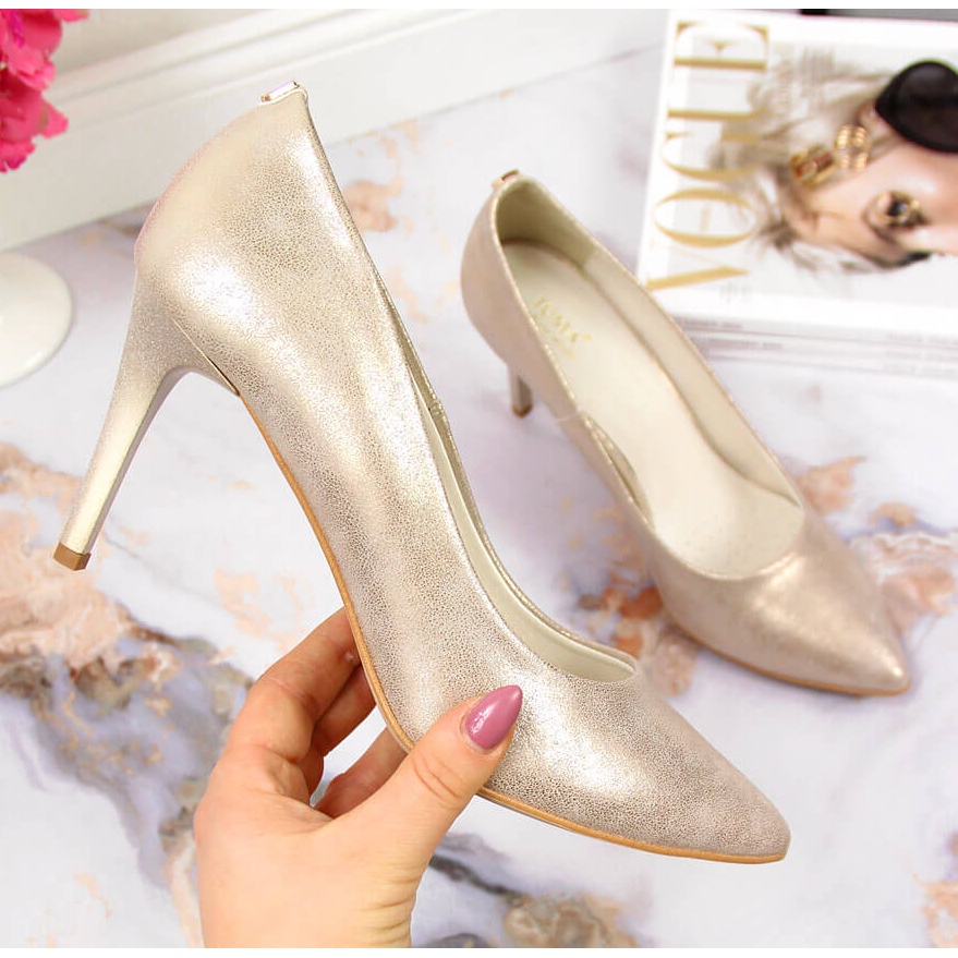 Löydä ainutlaatuiset kiiltävät kultaiset korkokengät tunnetulta puolalaselta Juma-brändiltä! Nämä erittäin muodikkaat pumput täydentävät täydellisesti sekä elegantteja että hienoja tyylejä. Niiden kiiltävä kultainen pinta herättää huomion, ja innovatiivinen, erittäin pehmeä pohjallinen tekee jopa useamman tunnin käyttämisestä puhdasta nautintoa.