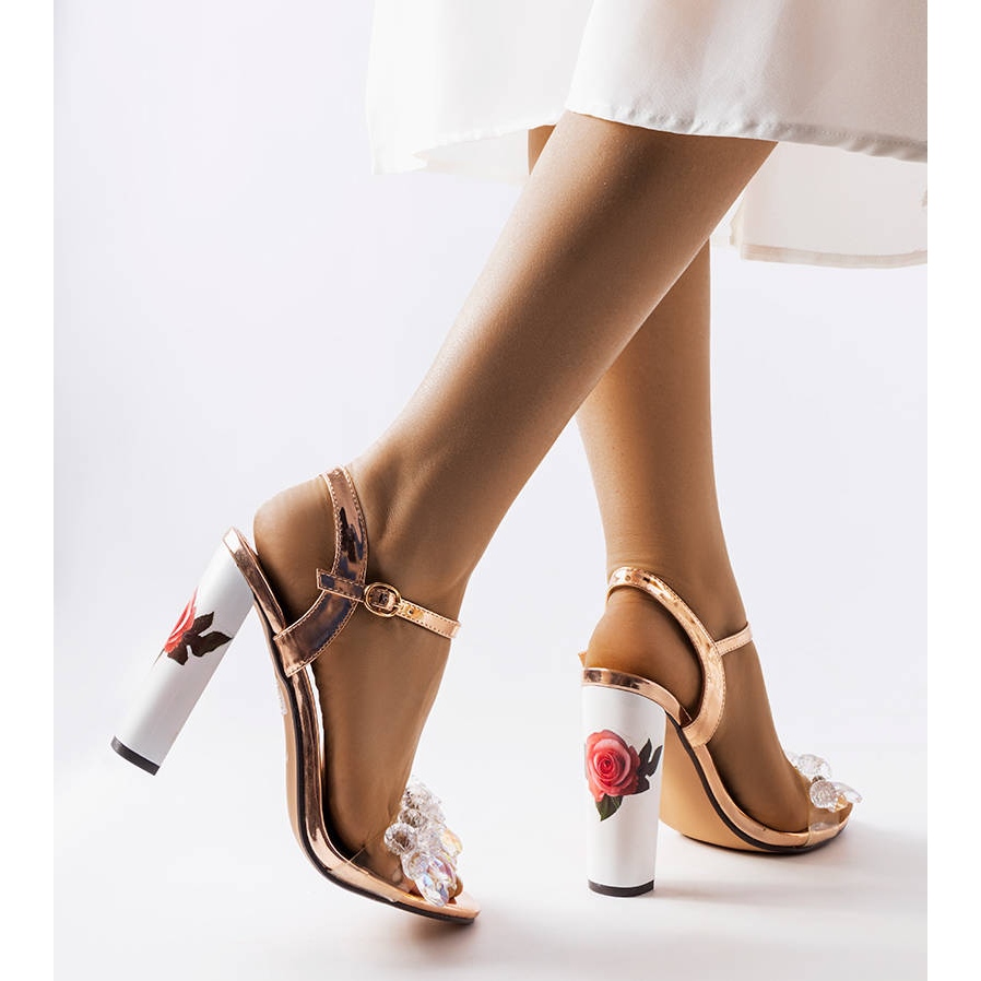 Beigellä pohjalla varustetut kultaiset sandaalit ovat tyylin ja eleganssin huippu. Pohjan luomiseen käytetty muovi on kestävää ja takaa vakauden kävellessä. Ekologisesta nahasta valmistettu pohjallinen varmistaa käyttömukavuuden ja ulkomateriaali, joka on myös valmistettu ekologisesta nahasta, lisää ajatonta charmia kenkiin.