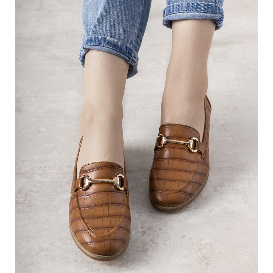 Korkealaatuisesta ekologisesta nahasta valmistetut mokasiinit ovat suosittuja ruskean sävyjä, jotka sopivat helposti useisiin eri tyyleihin. Lisäkorosteena on päälliseen sijoitettu herkkä kultainen solki, joka antaa koko lookille tyylikkään ja eleganssin. Pehmeä päällinen takaa käyttömukavuuden ja mukautuu täydellisesti jalkaan.