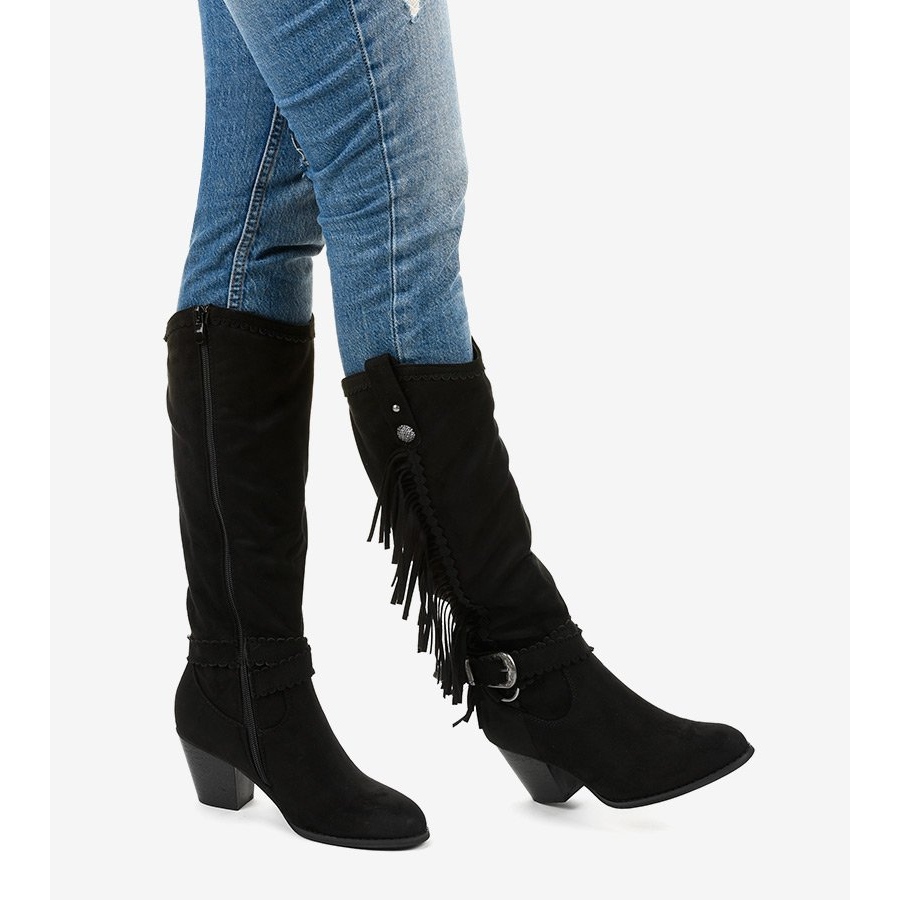 Esittelyssä mustat mokkanahkaiset Kellyn cowboysaappaat, jotka sopivat täydellisesti muodikkaan boho-tyyliin ja moniin muihin tyyleihin. Vaikuttavan, herkillä hapsuilla koristellun päällisen, kaiverretulla soljella varustetun vyön ja retronappien ansiosta näistä kengistä tulee ainutlaatuinen elementti jokaiseen vaatekaappiin.