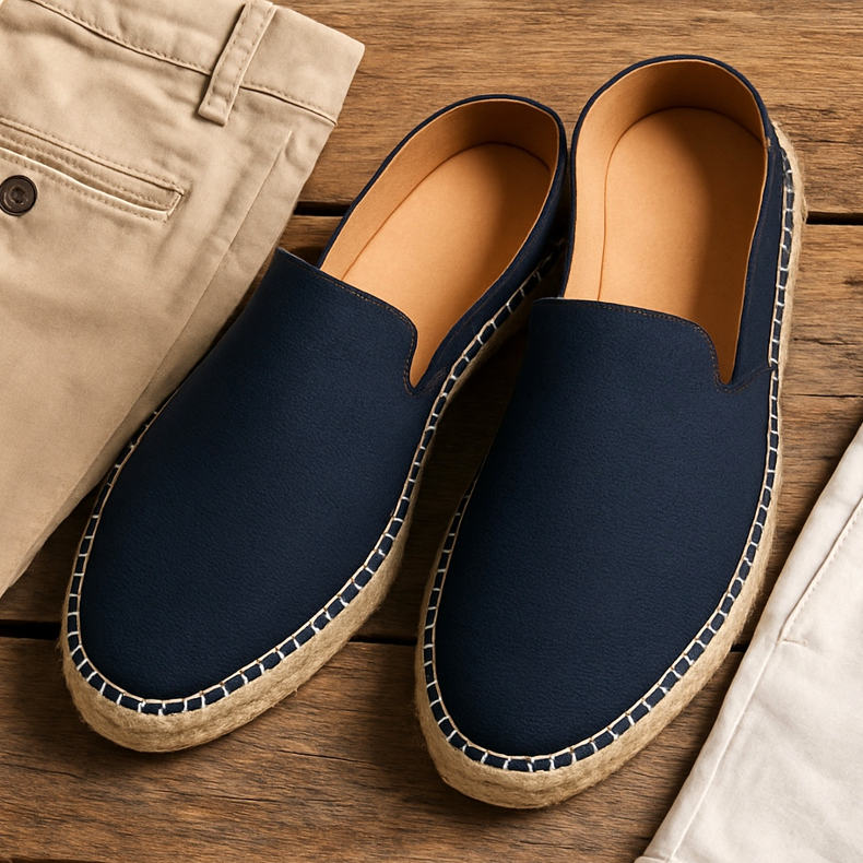 Espadrillit ovat ikonisia kesäkenkiä, jotka on usein valmistettu kankaasta tai pellavasta ja joissa on ominainen punottu juutti- tai sisalpohja. Miesten espadrilleissa voi olla avoin kantapää (slip-on muulit) tai suljettu muoto. Ne sopivat täydellisesti rentoon tyyliin shortsien, chinojen tai pellavahousujen kanssa. Saatavana hillityissä väreissä (beige, laivastonsininen, khaki) tai printillä, ne ovat kesän rennon ruumiillistuma. Mukavuuden lisäämiseksi kannattaa valita mallit, joissa on nahkainen sisäosa.