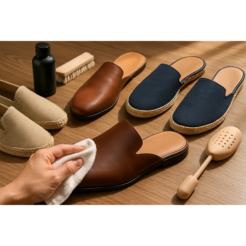 Nahkamuulit tulee puhdistaa säännöllisesti kostealla liinalla ja kyllästää nahkavalmisteilla, jotta ne eivät vaurioidu kosteuden ja auringon vaikutuksesta. Espadrillit ja kangasbabushkat voidaan puhdistaa harjalla ja saippualla välttäen juutin tai kudotun pohjan liottamista. On tärkeää tuulettaa kenkiäsi jokaisen käyttökerran jälkeen, varsinkin kun niitä käytetään paljain jaloin. Tuoksuvien ja antibakteeristen tyynyjen käyttö auttaa säilyttämään tuoreuden. Säilytä ne viileässä, ilmavassa paikassa, vältä suoraa auringonvaloa.