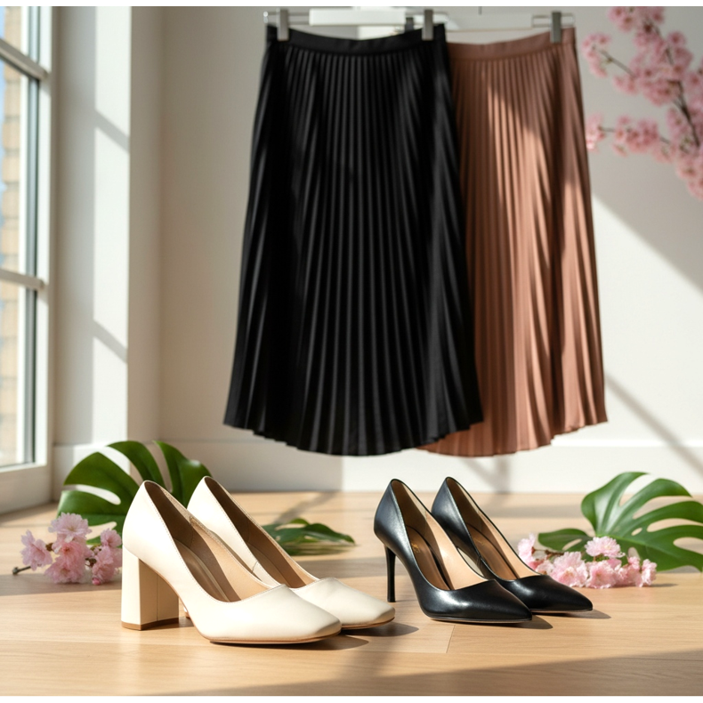 Kevään 2026 kaudella pumput, joissa on neliömäinen kärki ja lohkokorko, ovat erityisen muodikkaita - ne tarjoavat stileton vakautta ja paljon enemmän mukavuutta. Kengän värin tulee olla lähellä ihon sävyä tai olla samassa sävyssä kuin hame - tämä luo jalan pituuden katkeamattoman viivan vaikutelman. Mustat kengät mustalla midihameella toimivat myös hyvin.
