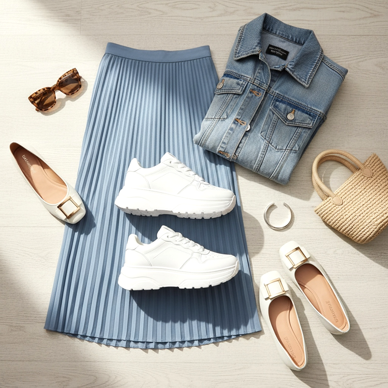 Viime kausien suuri trendi on tyylikkäiden tai naisellisten hameiden yhdistäminen arkikenkiin. Laskostettu midihame + valkoiset lenkkarit + katana on vuoden 2026 muotibloggaajien arkkityyppinen look. Tämä kontrasti - hameen pehmeys ja naisellisuus vs. urheilujalkineet - on tarkoituksellista ja antaa tyyliin modernia luonnetta.