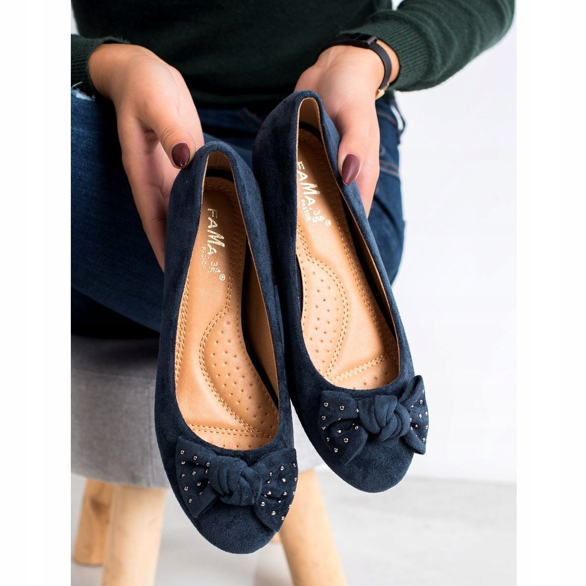Fama-balettihuoneistot erottuvat kauniista yksityiskohdasta - jousesta, joka antaa niille ainutlaatuisen viehätyksen. Sisäänrakennettu, pehmeä kantapää ja 3 cm korkea kantapää tekevät niistä mukavat käyttää koko päivän, ja sileä muovitaso tekee niistä käytännöllisiä ja kestäviä.