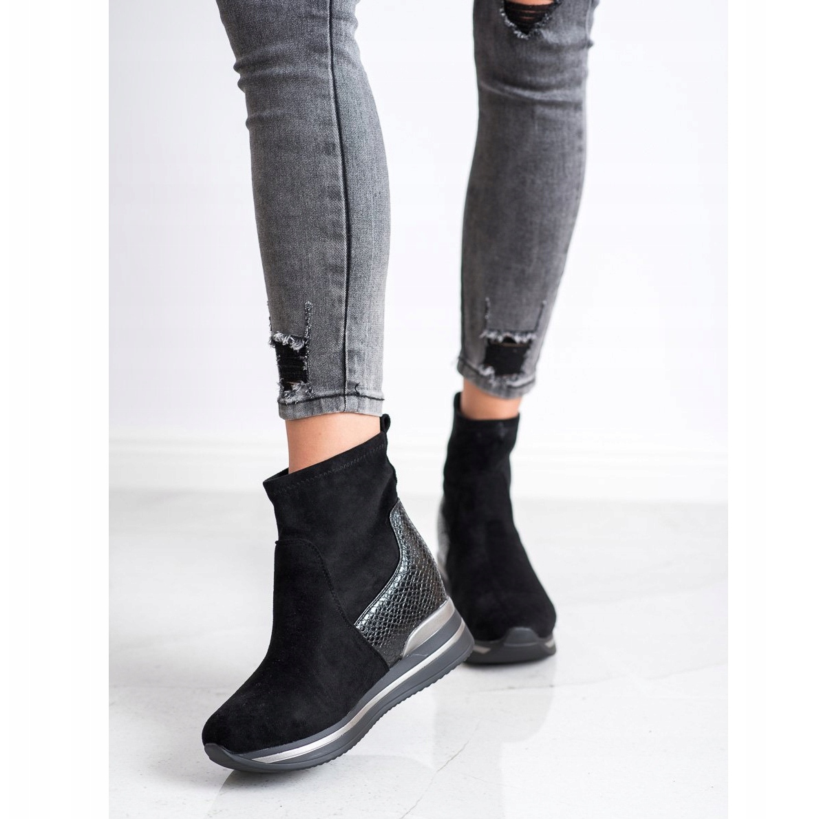 Esittelemme Gogo Wedge -nilkkurit elegantissa mustassa värissä, joka täydentää täydellisesti kaikki syksyn ja talven tyylit. Näissä ainutlaatuisissa naisten nilkkureissa yhdistyvät muodikas muotoilu ja mukavuus, mikä tekee niistä täydelliset jokapäiväiseen käyttöön.