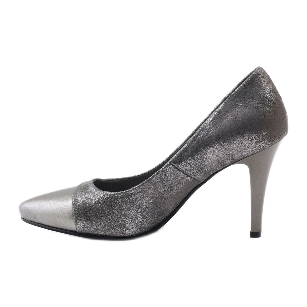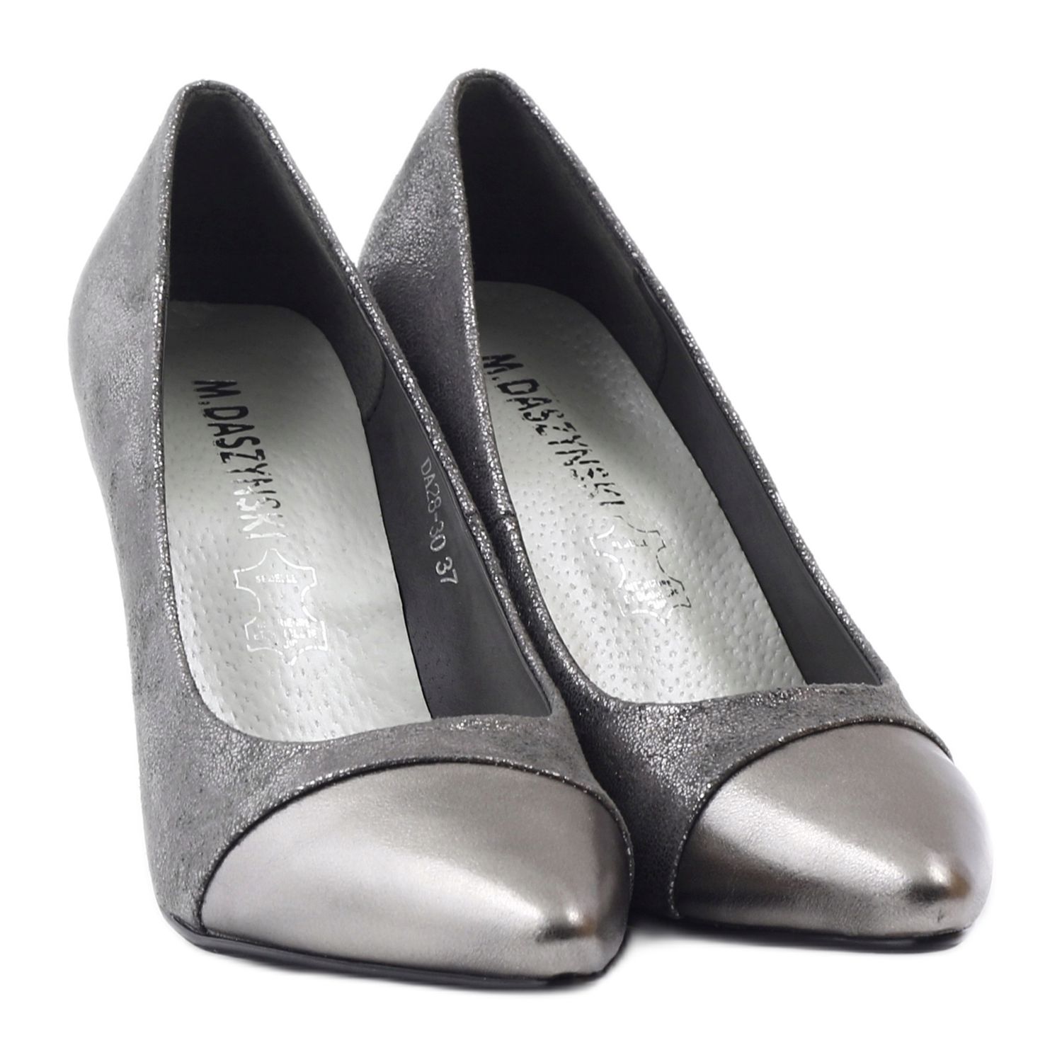 M.Daszyński DA28 kiiltävät pumput ovat tyylikäs valinta naisille, jotka haluavat yhdistää mukavuuden muodikkaan lookin. Nämä tyylikkäät kengät ovat saatavilla harmaan sävyssä, joka hohtaa hienovaraisesti hopealla. Hopeanvärinen kärki antaa niille ainutlaatuisen luonteen, mikä tekee niistä täydellisen täydennyksen sekä arki- että iltatyyliin.