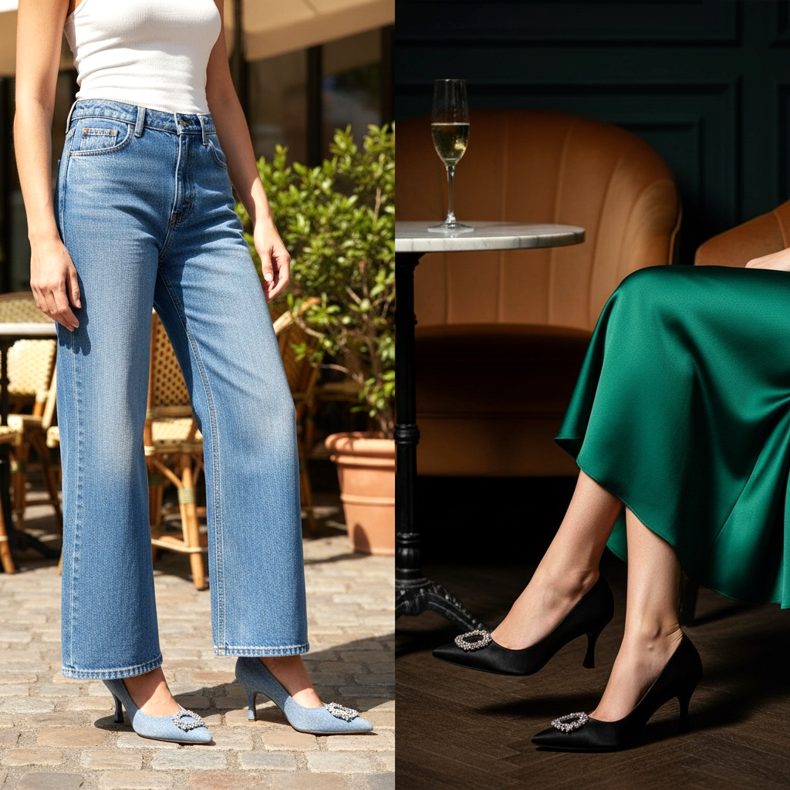 Kitten-korkokengät sopivat täydellisesti illanviettoon vintage-tyylisen satiinisen midi-mekon kanssa. Herkkä kantapään korkeus ja klassinen leikkaus sopivat vuonna 2026 hallitsevaan vanhan rahan ja pariisilaisen tyylikkään estetiikkaan.