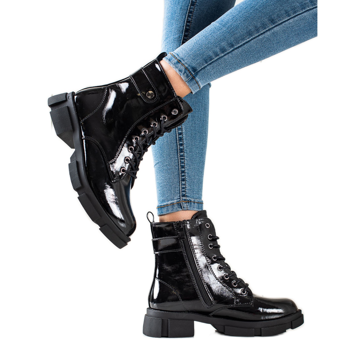 Valmistettu korkealaatuisesta nahkaa jäljittelevästä materiaalista, työntekijät näyttävät elegantilta ja modernilta. Lakattu viimeistely antaa niille ainutlaatuisen luonteen, joka sopii täydellisesti rentoon ja rock-tyyliin. Sisäänrakennetun, pehmeän kantapään ja eristyksen ansiosta nämä saappaat tarjoavat paitsi tyyliä myös maksimaalisen mukavuuden kylmempinä päivinä.