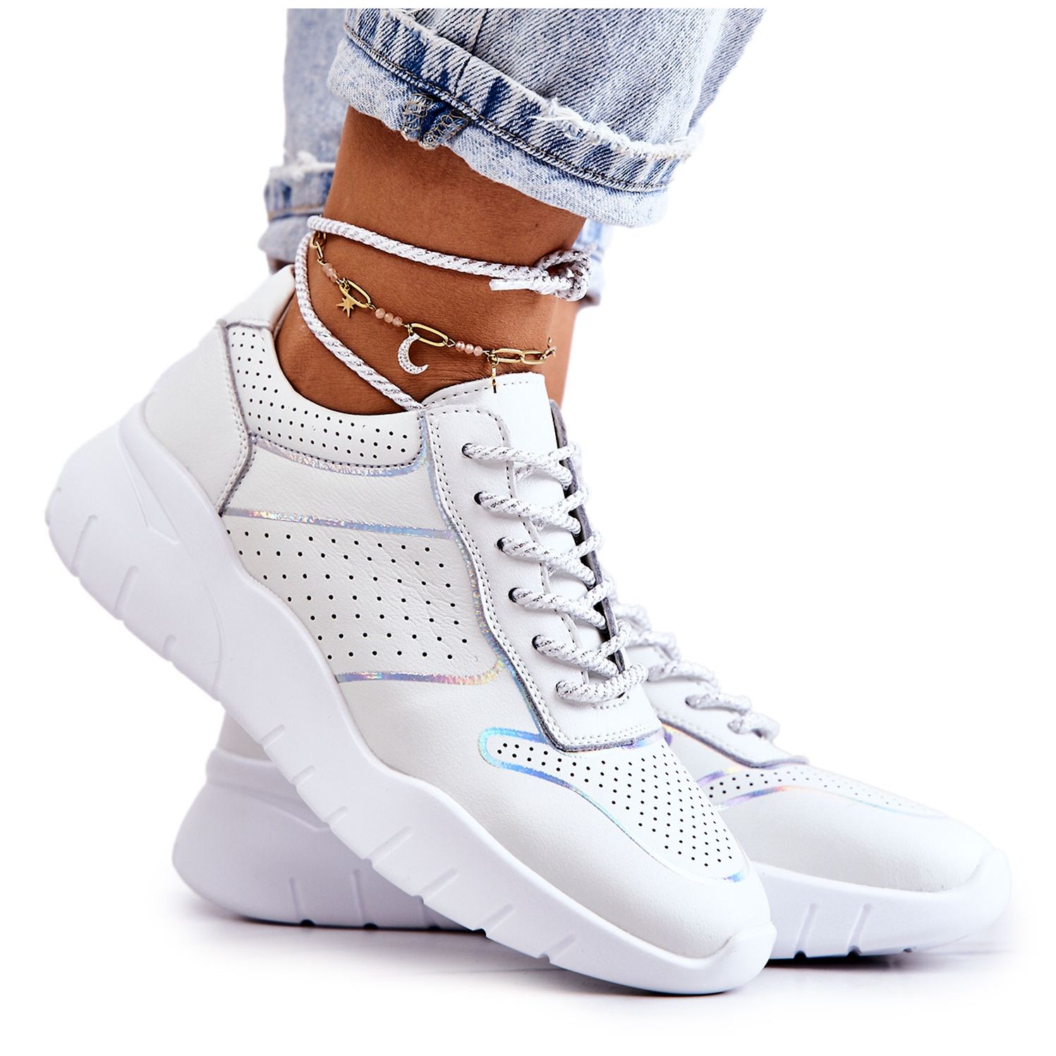 S. Barski Carly - klassiset valkoiset lenkkarit valkoisella yhdistämällä urheilun mukavuuden hienovaraiseen, muodikkaan viimeistelyn. Valmistettu luonnollisesta, rei'itetystä nahasta, ne tarjoavat hyvän ilmanpoiston ja tyylikkään ilmeen. Luonnollisen nahkainen pehmeä insertti takaa mukavuuden koko päivän, ja hiukan pitkänomainen, pyöreä nenä ja nauhoitus pyöreille kengännauhoille korostavat niiden universaalia luonnetta. Holografiset insertit yläosaan lisäävät modernin aksentin.