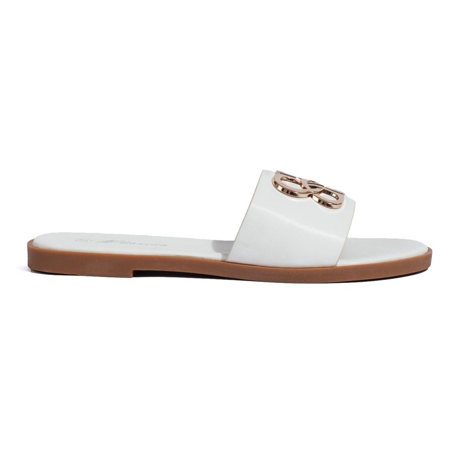 Varvastossojen valkoinen väri, joka on muotiklassikko, tarjoaa laajat muotoilumahdollisuudet ja sopii useimpiin vaatteisiin, niin farkkuihin kuin kesämekkoihin ja hameisiin. Kultainen koristelu lisää ripauksen luksusta sandaaleihin ja korostaa jalkineiden rentoa mutta hienostunutta luonnetta.