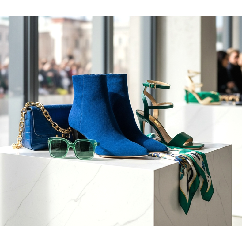 Koboltti, tämä sähköistävä, eloisa sinisen sävy, esiintyi Valentinon, Bottega Venetan ja monien muiden arvostettujen muotitalojen näytöksissä. Smaragdinvihreä puolestaan korosti Gucci- ja Jacquemus-kokoelmat. Molemmat värit ovat nyt siirtymässä kenkämarkkinoiden kaikille tasoille - luksuslenkkareista edullisiin ketjukokoelmiin.