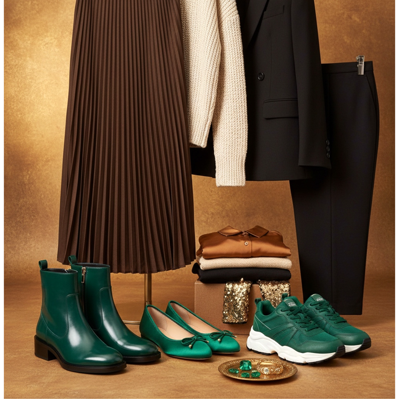Smaragdinilkkurit tai -loaferit sopivat täydellisesti ruskean, karamellin ja kullan kanssa - yhdistelmä, joka tuo mieleen Lähi-idän ja eksklusiivisen tunnelman. Kokeile smaragdibalettiasuja, joissa on pitkä suklaanruskea hame ja kermanvärinen neule – se on tyyli, joka ilahduttaa kaikkia.