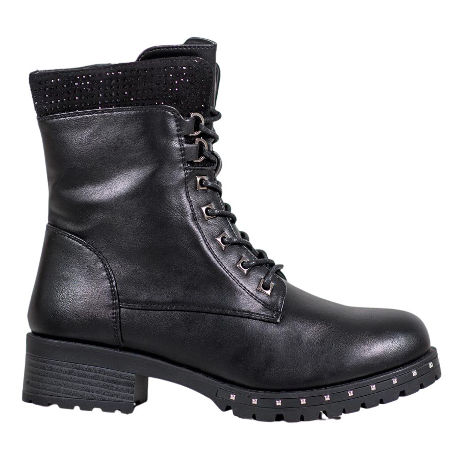 16 cm korkea päällinen suojaa tehokkaasti epäsuotuisilta sääolosuhteilta ja pyöreä kärki lisää hienovaraisuutta. Korkea ja litteä synteettinen pohja, 2 cm paksu, varmistaa vakauden ja mukavuuden joka askeleella. Lisäksi strassit ja nappi yläosassa ovat tyylikäs aksentti, joka antaa kengille rock-luonteen.
