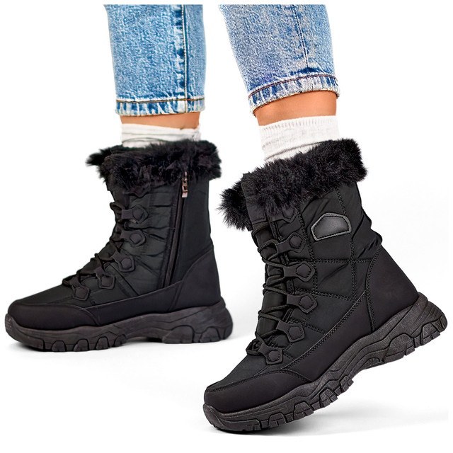 Yksityiskohdat: Korkeat, eristetyt lumisaappaat, urheilulliset naisten talvikengät, paksusti eristetty musta