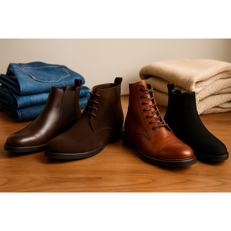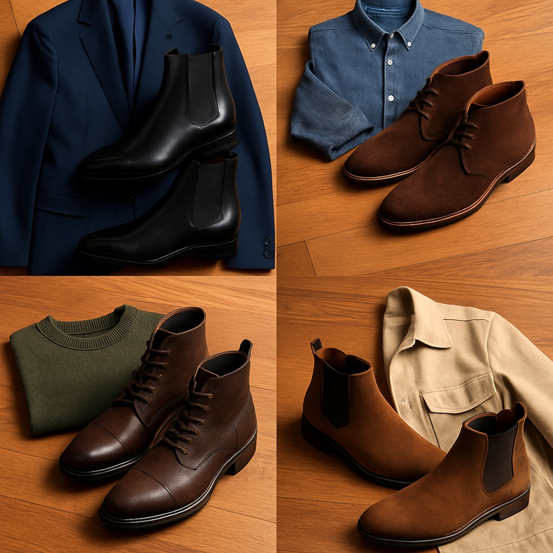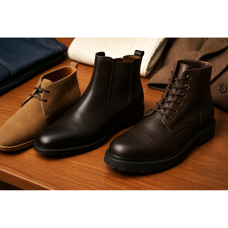 - Kasvu — lyhyemmät miehet: valitse ohuita malleja (Chelsea, kapeat chukkat) massiivisten laukkusaappaiden sijaan.
