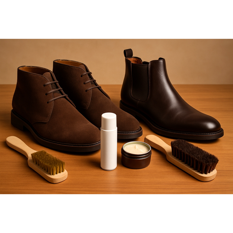 Kengänvärinen kerma tai tahna, jouhiharja, setrikenkäpuut jokaisen käytön jälkeen.