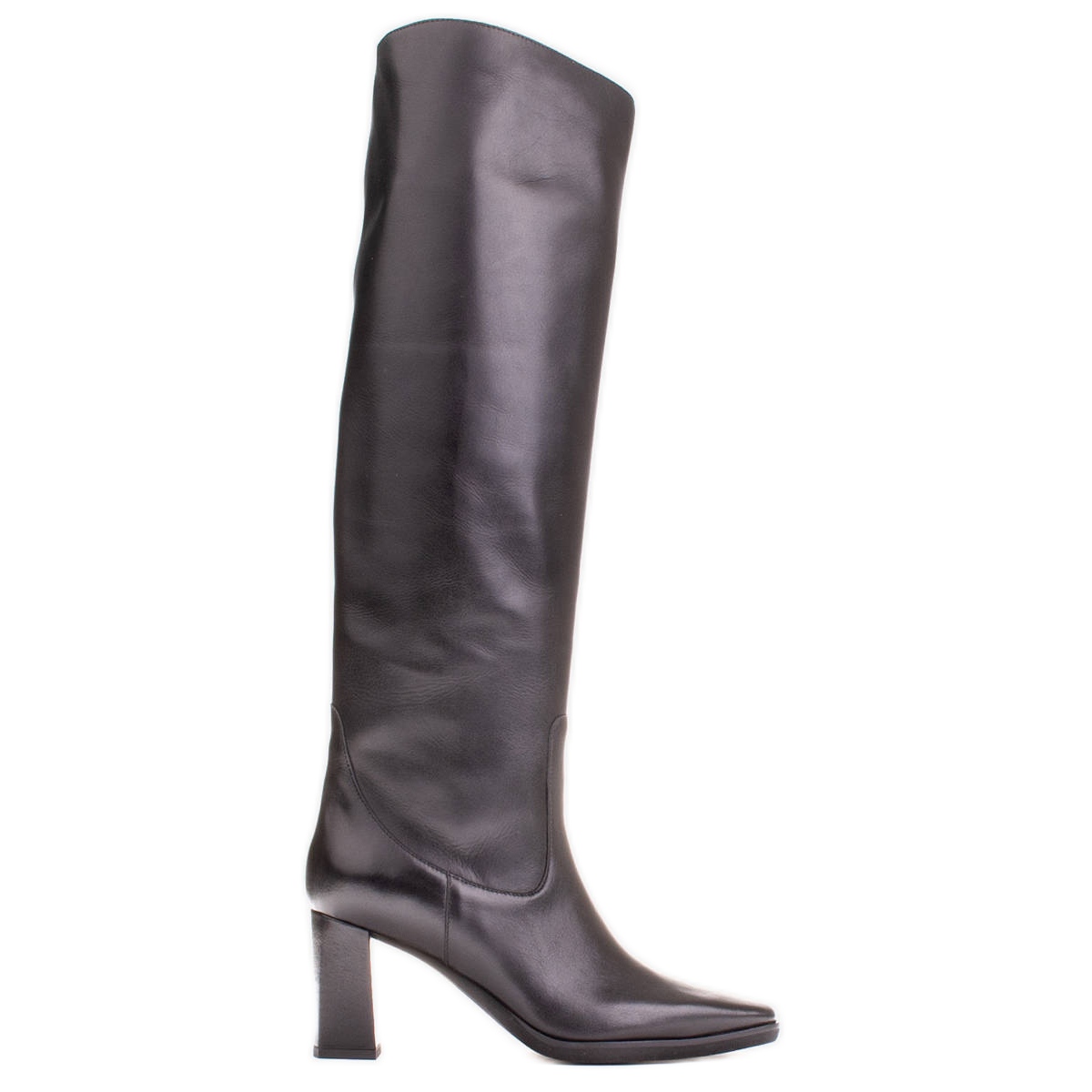 Näiden saappaiden kokonaiskorkeus on 53 cm ja yläosan (koossa 37) ympärysmitta 40 cm, joten ne mukautuvat erilaisiin siluetteihin, ja niiden klassinen leikkaus neliömäisellä kärjellä antaa niille ylevän luonteen. Koron korkeus on 7,5 cm, mikä tekee mallista mukavan ja samalla lisää eleganssia mihin tahansa tyyliin.