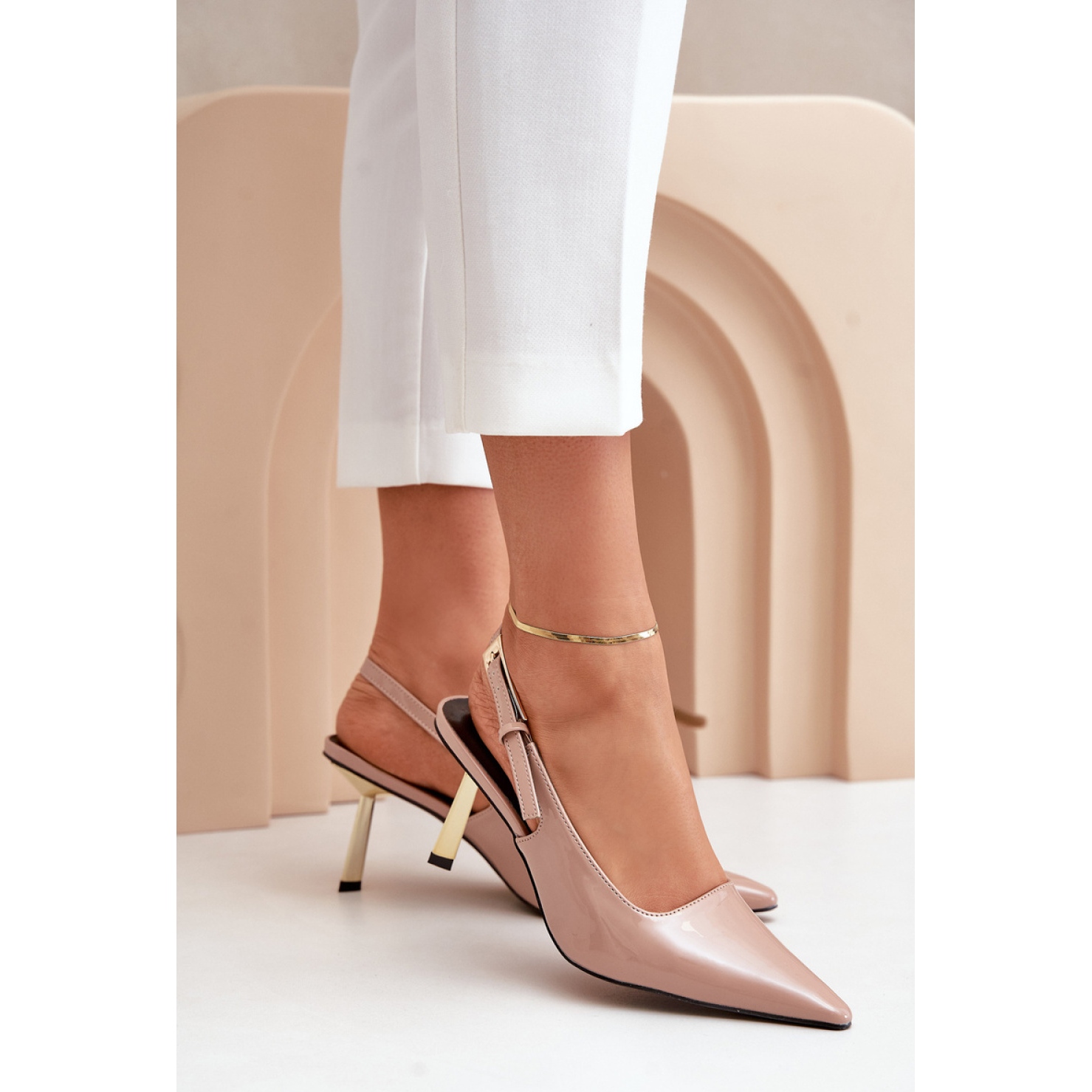 Kultainen, koristetappi, jonka korkeus on 8 cm, korostaa heidän yksinoikeuttaan, ja terävät nenät antavat heille poikkeuksellisen eleganssin. Säädettävän hihnan ansiosta korkokengät sopivat täydellisesti jalkaan, mikä tarjoaa vain muodikkaan ilmeen, vaan myös mukavuuden.