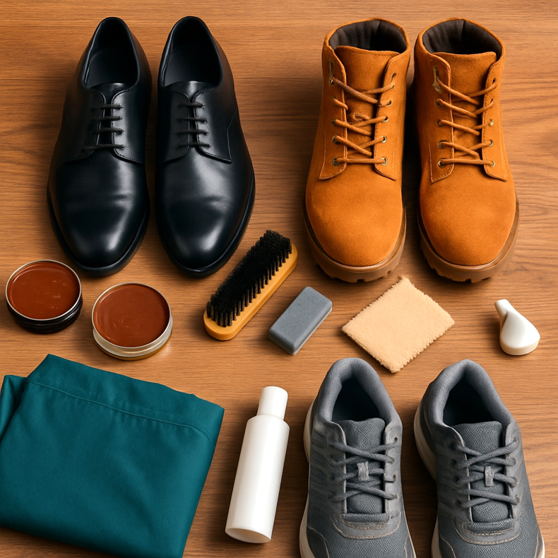 Osta: kenkävoide, kyllästysaine, siveltimet (pehmeälle nahalle ja mokkalle), puiset kenkäpuut, kenkädeodorantti, sanomalehti kuivaukseen.