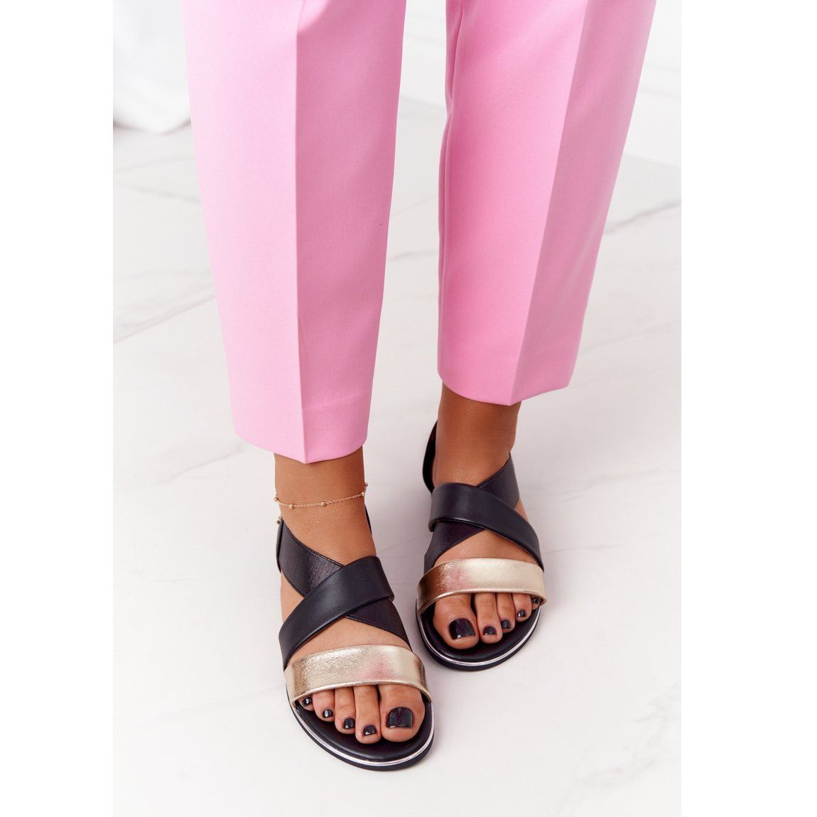 Yksityiskohdat: Kultaiset ja mustat ribbiset sandaalit