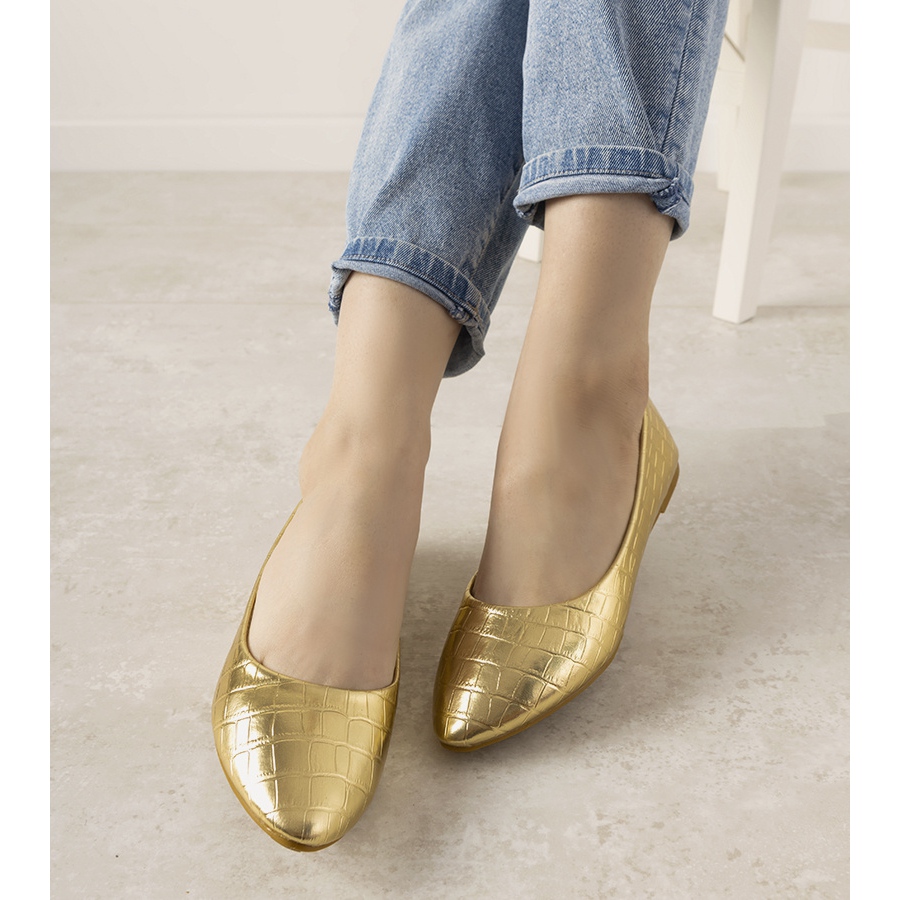 Camilia kultaiset balerinakengät krokotiilin ihokuvioidulla on tyylikäs tarjous jokaiselle naiselle, joka haluaa lisätä tyyliään hieman kiiltoa. Nämä laadukkaasta ekologisesta nahasta valmistetut balettitassut ilahduttavat paitsi ulkonäöllään myös käyttömukavuudellaan.