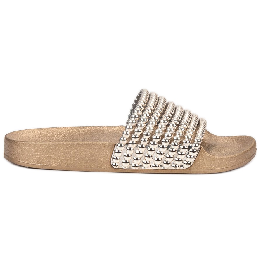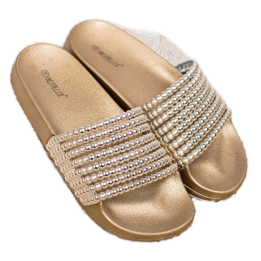 Tutustu Bestelle-brändin ainutlaatuisiin helmmäisiin liukumäkiin, joissa yhdistyvät mukavuus ja muodikas tyyli. Nämä varvastossut ovat kauniissa keltaisessa sävyssä, jossa on hienoja kultaisia aksentteja, ja ne herättävät varmasti huomion ja lisäävät luonnetta kaikkiin kesätyyliin.
