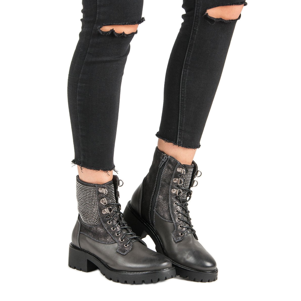 Löydä ainutlaatuinen tyyli Ideal Shoes -nauhoitustasotyöntekijöiden kanssa voimakkaan vihreässä sävyssä. Nämä tyylikkäät naisten nilkkurit ilahduttavat paitsi ainutlaatuisella muotoilullaan, myös käytännöllisyydellään ja käyttömukavuudellaan. Valmistettu korkealaatuisesta ekologisesta nahasta, tumman harmaa-vihreänä, ne sopivat täydellisesti syksyn ja talven trendeihin.