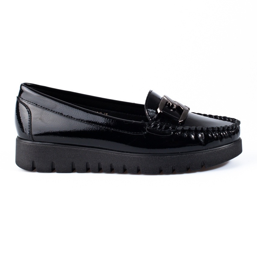 Potocki naisten mokasiinit ovat täydellinen valinta naisille, jotka arvostavat eleganssia ja mukavuutta jokapäiväisessä käytössä. Klassisen mustan värisestä kiiltonahasta valmistetut loaferit sopivat täydellisesti sekä arki- että muodollisempiin tyyliin. Sisäänrakennetun kantapään ja slip-on-kiinnitysjärjestelmän ansiosta niiden pukeminen on nopeaa ja mukavaa.