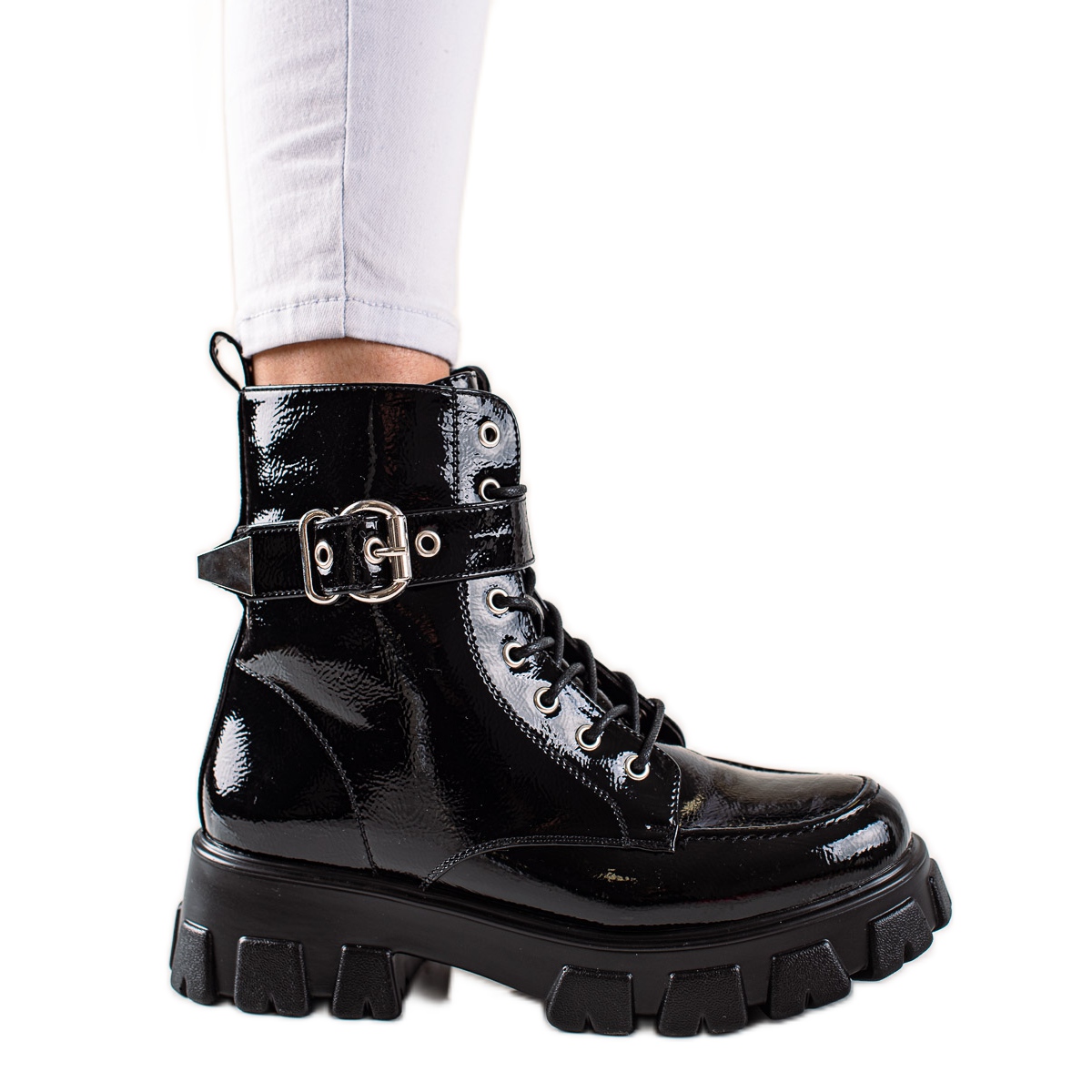 Esittelemme TRENDI-brändin tyylikkään mustan väriset soljilla varustetut kiiltonahkasaappaat, joista tulee varmasti suosikkielementtisi vaatekaappiisi tulevalla syys/talvikaudella. Näissä muodikkaissa nilkkureissa yhdistyvät rohkea rock-tyyli ja rento luonne, jotka sopivat täydellisesti uusimpiin trendeihin.