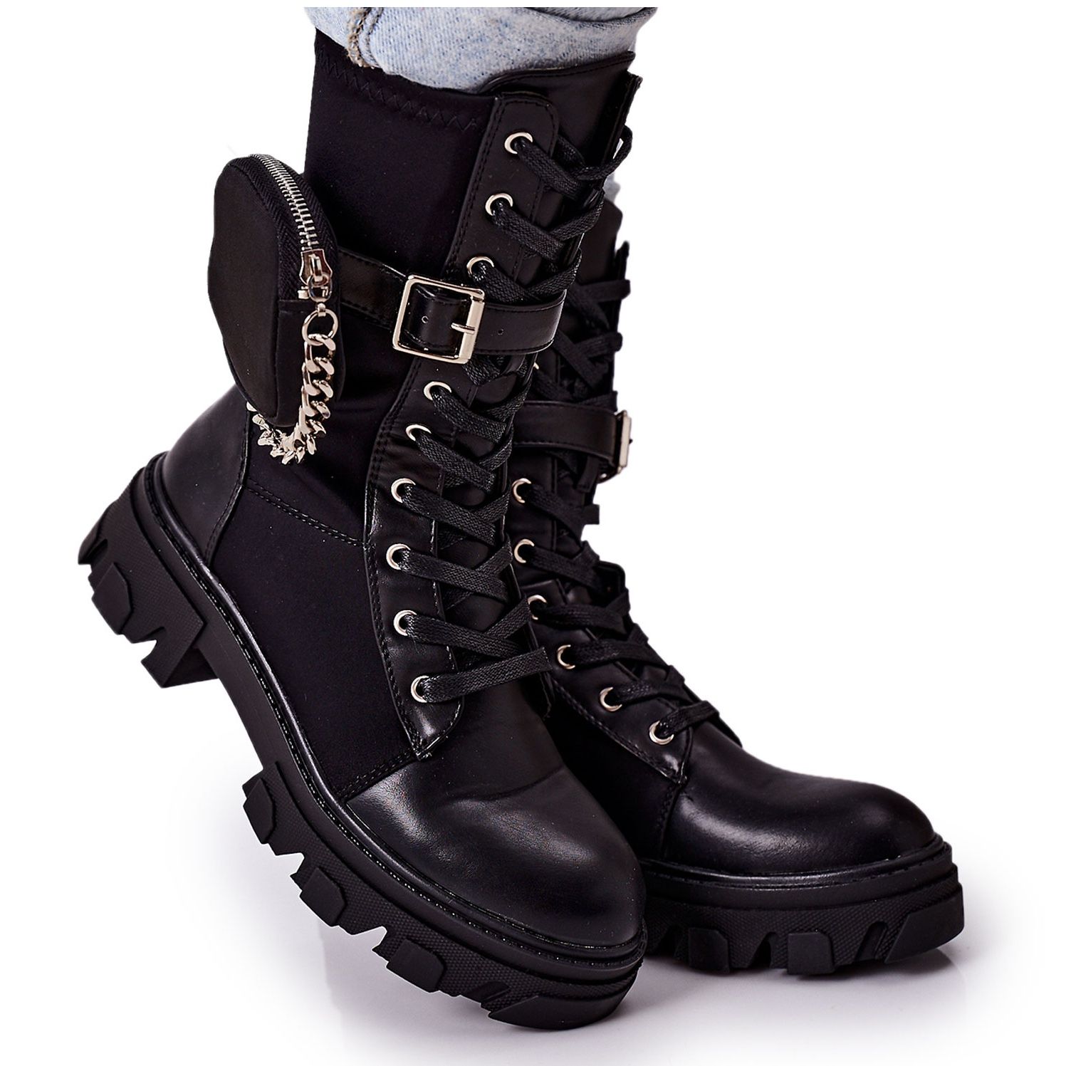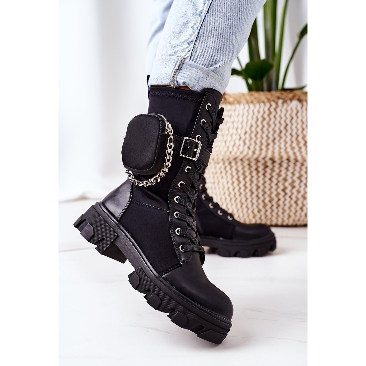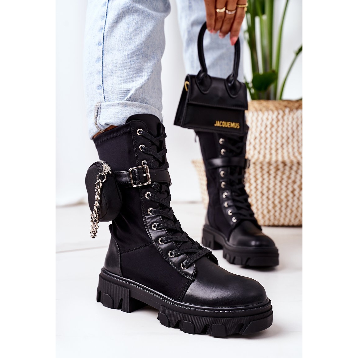 Kengän sisäpuoli on eristetty huolellisesti miellyttävän tuntuisella kenkäpeitolla, mikä tekee niistä ihanteellisen valinnan kylmimpiin päiviin. Mukavuuden ja käytännöllisyyden yhdistelmää tukevat myös irrotettavat lisävarusteet - fanny pack ja ketju, jotka tuovat kokonaisuuteen ainutlaatuisen luonteen.
