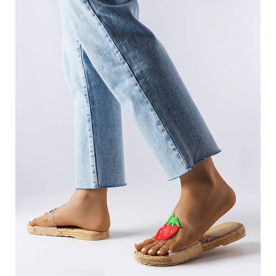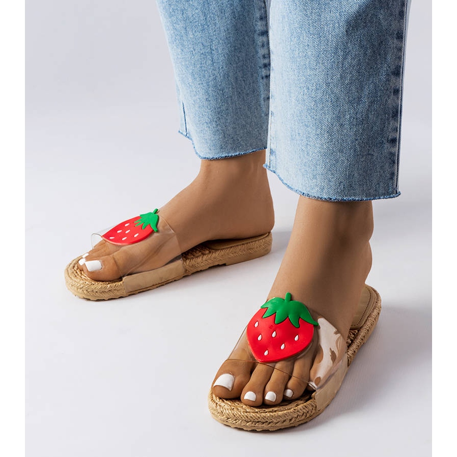 Näiden varvastossojen erottuva piirre on hienovarainen koristelu viehättävän mansikan muodossa, joka lisää niihin luonnetta ja tekee jokaisesta askeleesta muodin aksentin. Varvastossut korostavat kesätunnelmaa yhdistäen värittömän läpinäkyvyyden energiseen punaiseen aksenttiin.