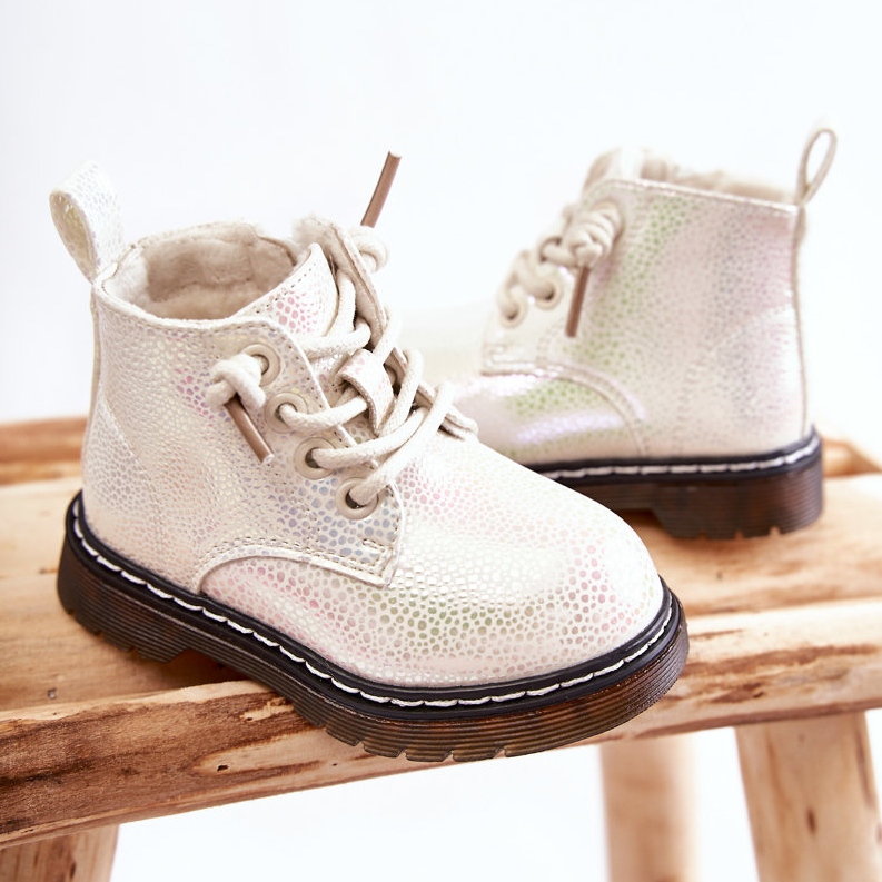 Tyylikäs ja käytännöllinen saappaat tytöille - valmistettu ekologisesta nahasta mielenkiintoisella tekstuurilla, eristetty pehmeällä jalkineella. Malli, jossa on nauhoitus ja käytännöllinen liukusäädin sivulla, mikä helpottaa laittaa. Jäykistetty kantapää varmistaa jalan vakautumisen ja tasaisen kantapään (2,5 cm) mukavuuden pelatessaan ja kävelemällä viileämpinä päivinä.