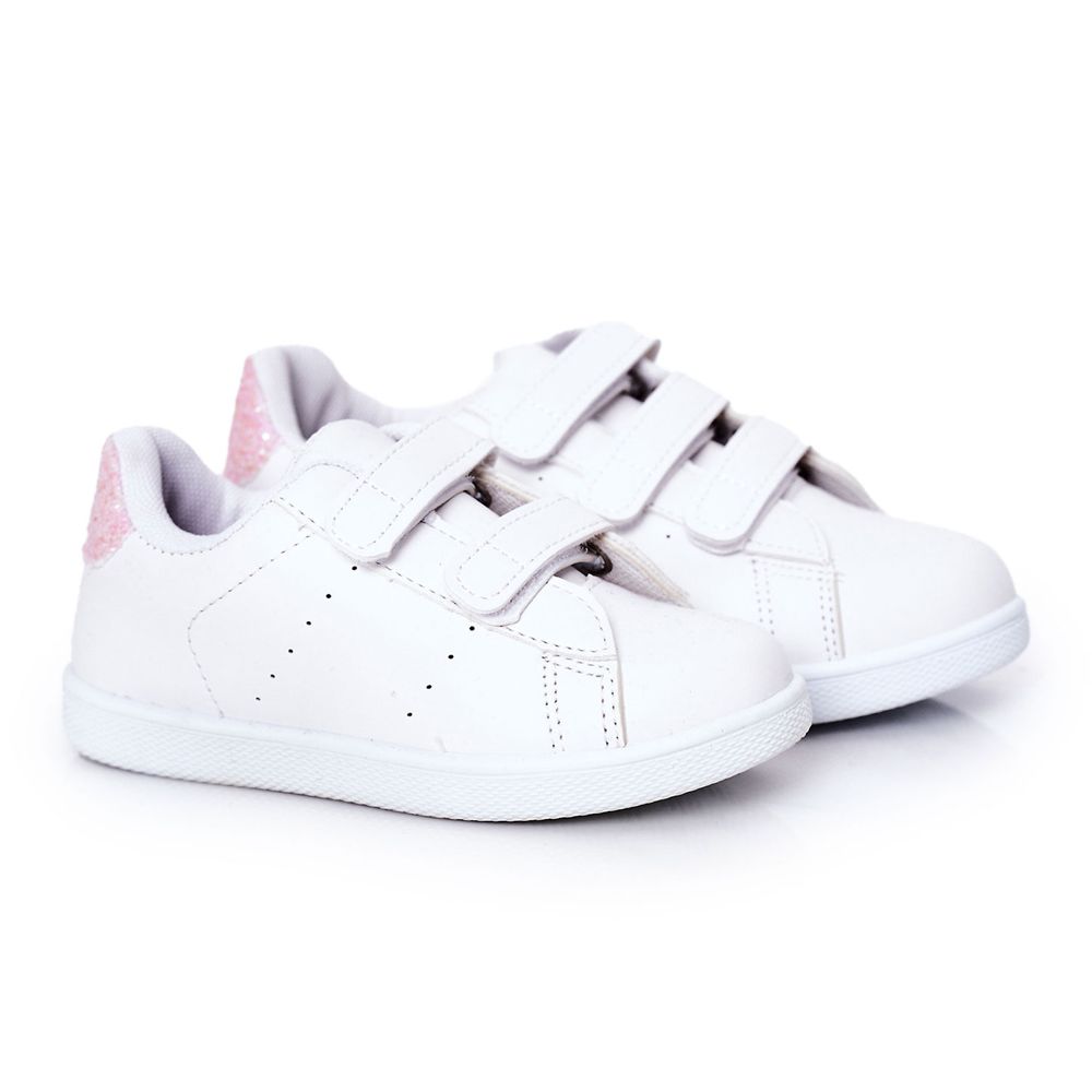 Yksityiskohdat: Lasten lenkkarit valkoisella ja vaaleanpunaisella tarranauhalla valkoinen