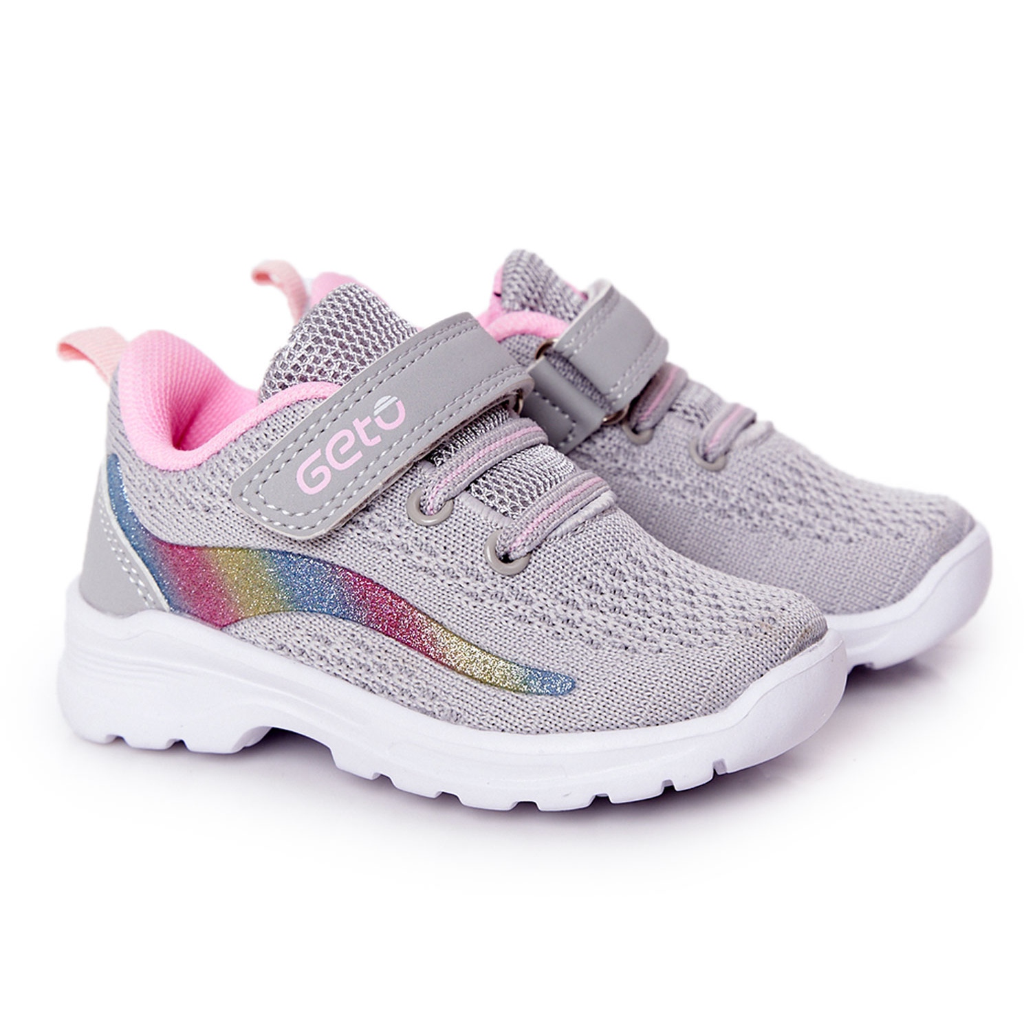 Esittelyssä lasten urheilukengät, Ready Go lenkkarit! muodikkaissa harmaissa ja vaaleanpunaisissa väreissä, joissa on monia värikkäitä aksentteja. Näissä tyylikkäässä tarranauhalla kiinnitetyissä kengissä yhdistyvät toimivuus ja moderni muotoilu, jotka sopivat täydellisesti aktiivisille tytöille.