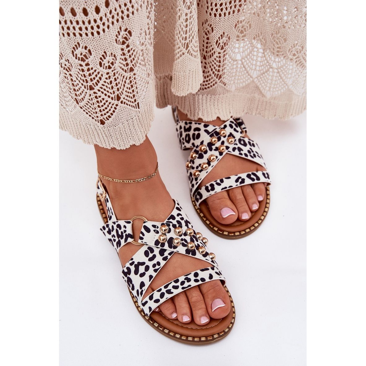 Yksityiskohdat: Litteäkorkoiset naisten sandaalit, joissa on kultavalkoiset nastat valkoinen