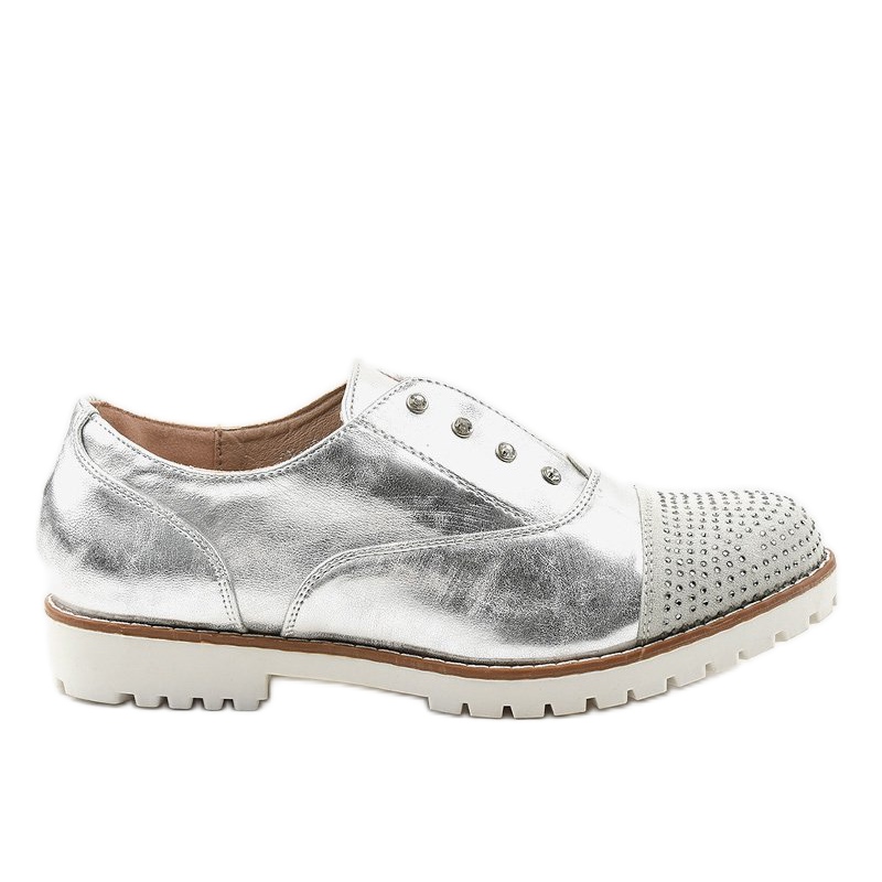 Hopeiset GF-FD9-napilla varustetut kengät ovat ainutlaatuinen malli, joka yhdistää täydellisesti eleganssin moderniin tyyliin. Nämä laadukkaasta ekologisesta nahasta valmistetut kengät eivät vain ilahdu ulkonäöllään, vaan myös takaavat käyttömukavuuden koko päivän. Niiden katseenvangitsija hopean väri yhdistettynä koristeellisiin nastoihin ja strassit tekevät niistä täydellisen täydennyksen sekä arki- että iltatyyliin.