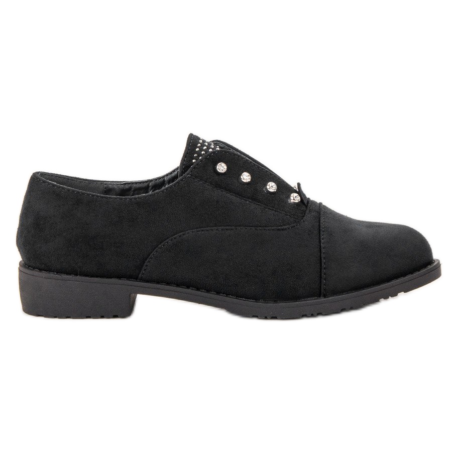 Kengät erottuvat tasaisesta 3 cm korkeasta kantapäästä ja sisäänrakennetusta pehmeästä kantapäästä, joka takaa käyttömukavuuden koko päivän. Lisäksi ne hurmaavat herkät strassit ja strassit, jotka tekevät niistä täydellisen täydennyksen jokapäiväiseen tyyliin. Mustan värin ja klassisen rento tyylin ansiosta voit yhdistää ne helposti erilaisiin asuihin tilaisuudesta riippumatta.