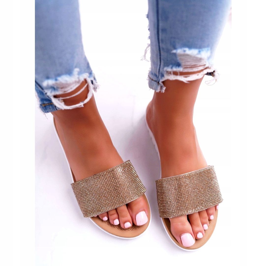 Ilahduta ympäristöäsi kauniisti sisustetuilla strassilla, jotka antavat näille varvastossuille ainutlaatuisen kiillon. Varvastossojen kultainen väri takaa, että ne herättävät huomiota ja sopivat täydellisesti erilaisiin kesätyyleihin. Valkoinen pohja on täydellisessä kontrastissa muun kengän kanssa luoden muodikkaan ja ilmeikkään ilmeen.