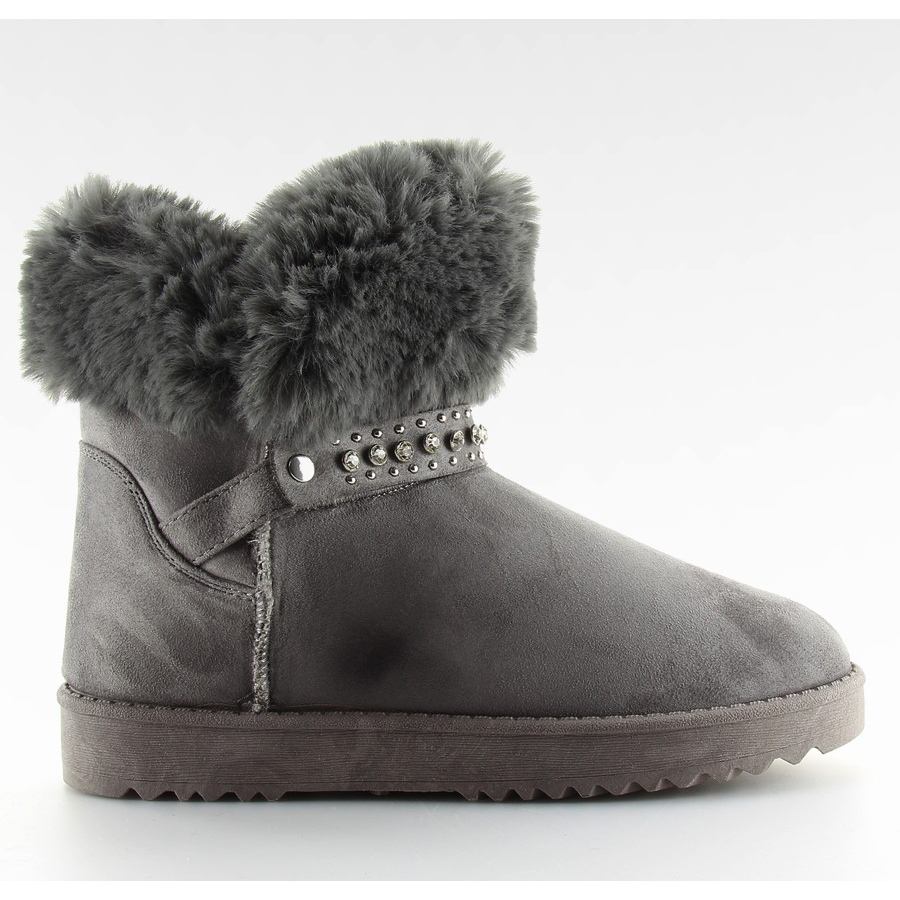 Klassiset, korkeat naisten lumisaappaat ekologisesta mokkanahkasta universaalin harmaan värisenä. Malli erottuu koristeellisesta strassilla nastoitettusta olkahihnasta, joka lisää kenkiin eleganssia ja saalistavaa luonnetta. Ne sopivat täydellisesti pakkaskävelyihin - ne on eristetty paksulla turkilla, ja kohotettu pohja (n. 2 cm) eristää sinut tehokkaasti kylmästä maasta.