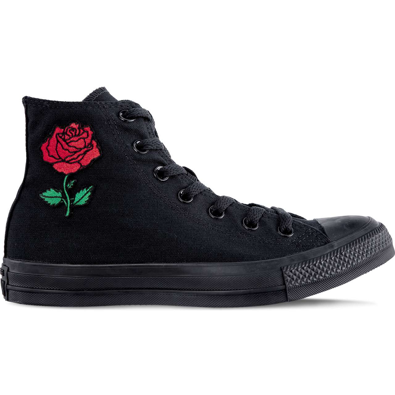 Klassiset, korkeatasoiset Converse-lenkkarit mustat hienovaraisesti punaisen ruusun ulkosivulla. Toista puolta koristaa sisäänommeltu Converse-logo. Valmistettu miellyttävästä kankaasta, hieman jäykistetty kantapään alueella, tyypillinen pyöreä kumilla päällystetty kärki ja musta kumipohja tummalla kulutuspinnalla - täydellinen yhdistelmä mukavuutta ja tyyliä.