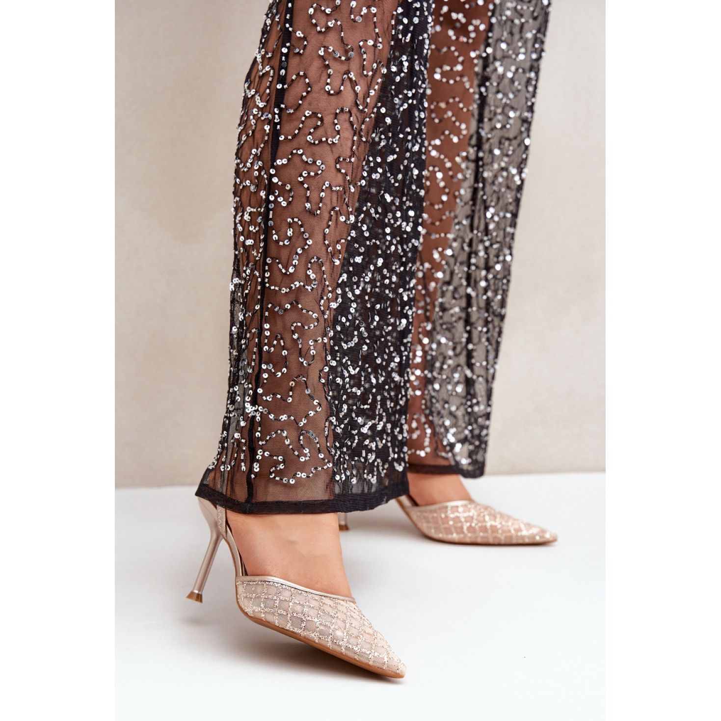 Korkokengät Berilae B1639-202 Kultaisen brokadin varjossa on ehdotus naisille, jotka haluavat lisätä ulkonäkönsä kiiltoon ja tyyliin. Nämä tyylikkäät kengät erottuvat terävistä varpaista, jotka pidentävät jalkoja optisesti, ja niiden kantapään korkeus 8,5 cm takaa aistillisen vaikutuksen. Kilkaisillä hiukkasilla peitetty kangas, korkokengät heijastavat hienovaraisesti valoa, mikä tekee niistä täydellisen valinnan iltamatkoihin, juhliin tai uudenvuodenaattotapahtumiin.
