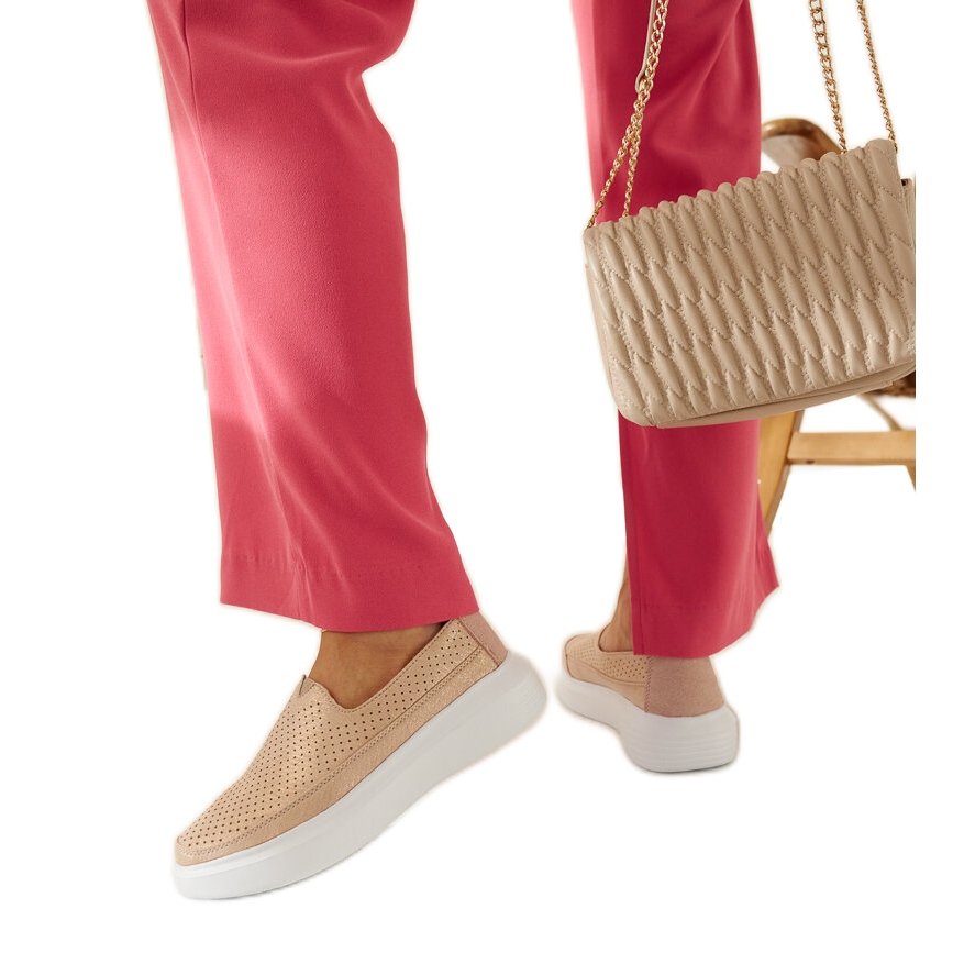 Nämä kesäleipät erottuvat pyöreästä nenästä ja mukavasta nahkalaususta, joka vaikuttaa puun mukavuuteen. Kumipohja varmistaa tarttuvuuden ja stabiilisuuden eri pinnoilla. Lisäksi pohjan valkoinen väri on täysin ristiriidassa ulomman materiaalin tyylikkään kultaisen sävyn kanssa.
